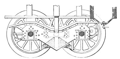 The valve-motion was given by a single fixed eccentric for each cylinder. Each eccentric-strap had two arms attached to it, one above and the other below, and, as the driving-axle was back of the fire-box, these arms were prolonged backward under the footboard, with a hook on the inner side of the end of each. The rock-shaft had arms above and below its axis, and the hooks of the two rods of each eccentric were moved by hand-levers so as to engage with either arm, thus producing backward or forward gear. This form of single eccentric, peculiar to Mr. Baldwin, was in the interest of simplicity in the working parts, and was adhered to for some years. It gave rise to an animated controversy among mechanics as to whether, with its use, it was possible to get a lead on the valve in both directions. Many maintained that this was impracticable; but Mr. Baldwin demonstrated by actual experience that the reverse was the case.