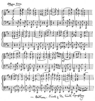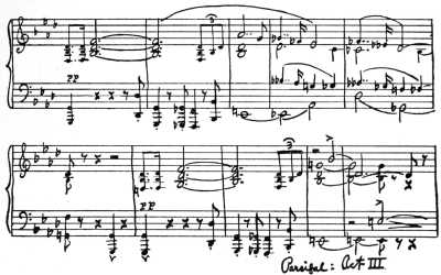 This quotation from Parsifal is given in the form of a piano reduction which does not convey well the "flourish of muted horns, remote, mysterious". Therefore, the piano reduction is followed by just the treble clef as it would sound played by horns.