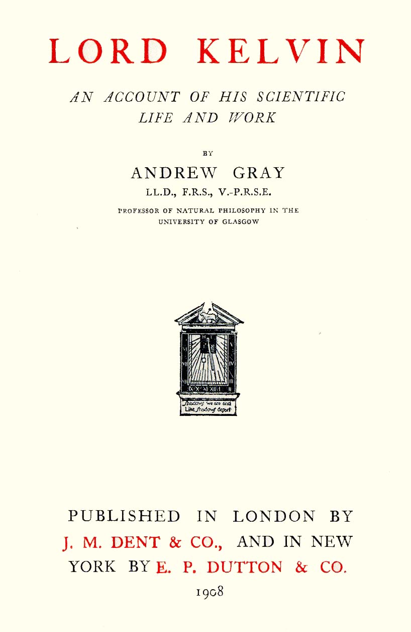 This book makes no claim to be a biography of Lord Kelvin in the usual sense. It is an extension of an article which appeared in the Glasgow Herald for December 19, 1907, and has been written at the suggestion of various friends of Lord Kelvin, in the University of Glasgow and elsewhere, who had read that article. The aim of the volume is to give an account of Lord Kelvin's life of scientific activity, and to explain to the student, and to the general reader who takes an interest in physical science and its applications, the nature of his discoveries. Only such a statement of biographical facts as seems in harmony with this purpose is attempted. But I have ventured, as an old pupil and assistant of Lord Kelvin, to sketch here and there the scene in his class-room and laboratory, and to record some of the incidents of his teaching and work.