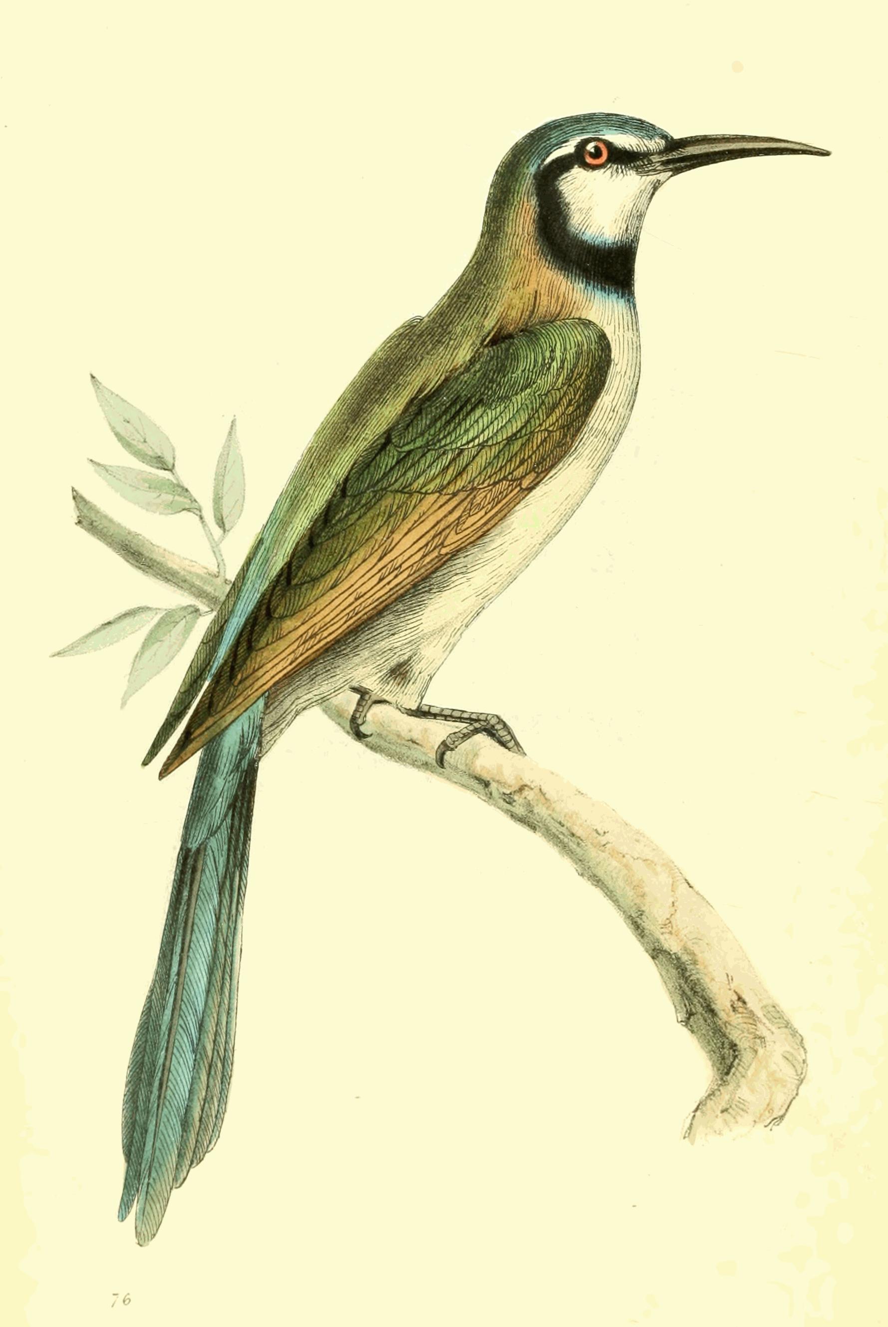 Total length eight inches and a half; size rather less than the common bee-eater; the crown in young birds is greenish, in some a dull brown, and in others deep black, margined in the front and sides of the head with a line of white; the ears black, uniting to a broad band across the neck of the same colour, which is margined on the lower part with beautiful sea blue; the nape of the neck, inner covers, and quill feathers, greenish fawn colour; the lesser quills tipt with black; the rump, tail, and outside of the quills next the body changeable greenish blue; the back and upper covers green beneath; the chin is white; the body tinged with greenish, and the under tail covers with blue: the tail three inches long, and in such specimens as have the two middle feathers lengthened, three and a half; bill and feet black.