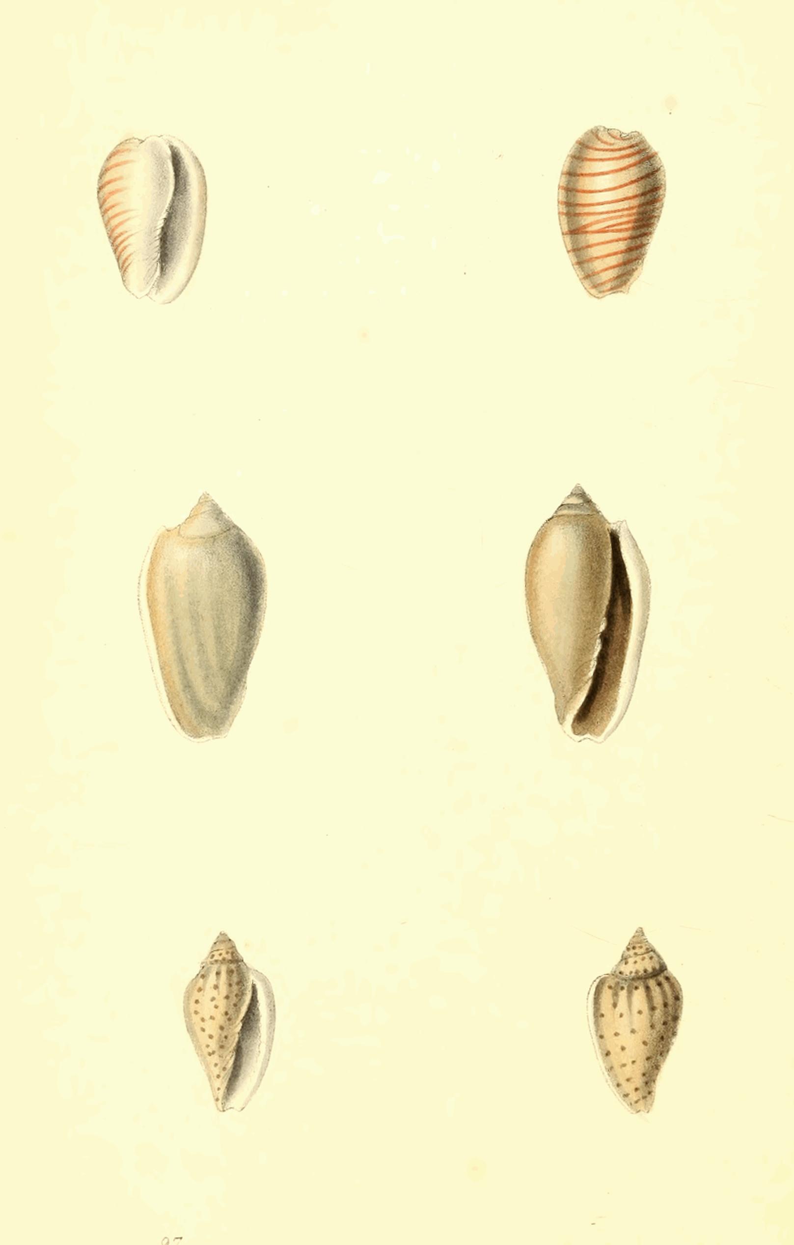 The species are numerous, and are found both in temperate and tropical seas; two or three inhabit our own coasts, but by far the greater number are found in the Asiatic Ocean. They are subject to variation in their colour; and this, joined with a general resemblance in form, has rendered the discrimination of the species very difficult. I have, however, remarked, that the various modifications of the umbilicus, and the termination of the pillar (which is indicated in many species by an elevated ridge or rib within the umbilicus) is a certain and constant indication, presenting the same peculiarity through all the individuals of a species, even in the young state. This termination of the pillar has been mistaken for the inner lip, which, on the contrary, is always above the umbilicus, which, if closed, is not closed by the lip, but by the thickened termination of the pillar or columella.