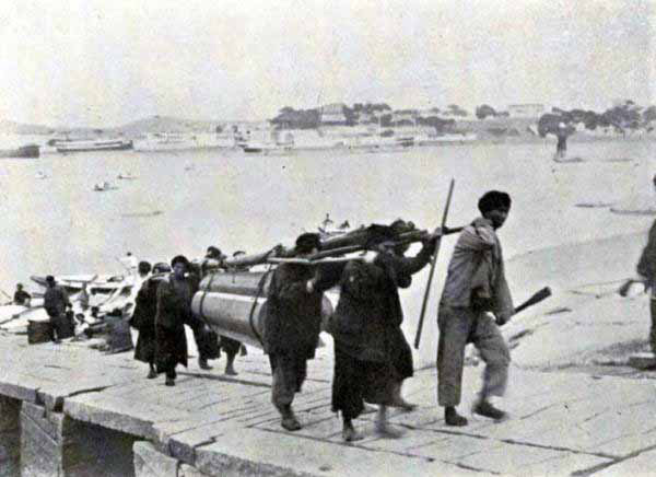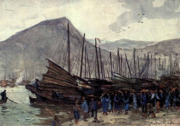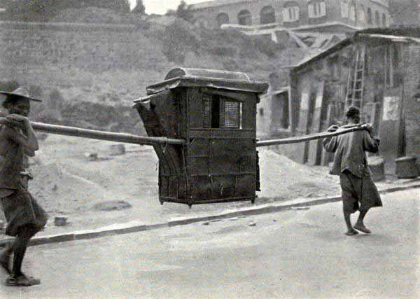 At this point our land journey ends, but before going on board we have to settle with our chair-bearers, and, as is universally the case in China, to part with these usually demands a little diplomacy. In spite of the fact that we had agreed upon the sum we were to pay them at the end of the journey, they were very insistent that we should make them a present in addition. This is one of the traditions of the profession, that “wine money,” as the tax is called, should be demanded from every fare they carry. If the day is stormy and the roads bad, amidst the loudly expressed complaints of the bearers at their sorrows and miseries, there will be continually heard the comforting assurances uttered by themselves, that at the end of the journey the present of the “wine money” will be a very liberal one. They repeat this so often that they finally come to consider that they are entitled to the sum they have mentioned, and when the stipulated fare has been handed over to them, they will assume an injured air as though they were being defrauded, and they will demand the “wine money” as a right which may not be denied them.