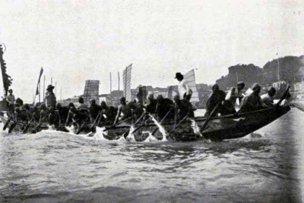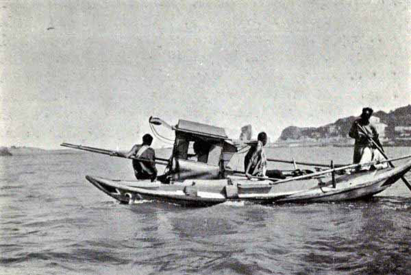 The boat was about twenty feet in length and five or six in width at the centre. It was divided into four sections. There was the bow, where the men stood when they rowed or hoisted the sail. Next to this was a room that was used as sitting-room, bedroom and dining-room. Further aft was a diminutive space where the servants could lie, and in the stern was the section where the steersman stood and guided the boat. It served also as a kitchen, for all the meals were prepared here, and at night, after the boat was anchored, the crew of four men lay upon the planks of the deck, and covering themselves with their wadded quilts, slept soundly till the dawn called them again to their work.