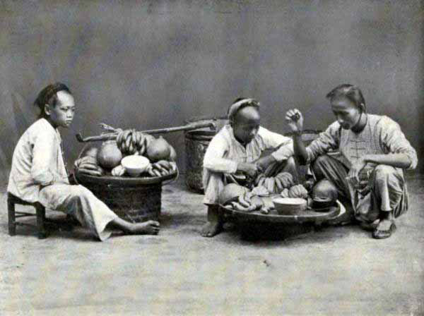 A further stage is reached by boiling the brown sugar in huge iron pans and pouring the liquid into coarse jars, the whole of whose interiors have been threaded backward and forward with coarse string. By the wonderful alchemy of nature these have the power of crystallizing the boiling liquid, and the result is a brown sugar candy, that whilst it is wanting in the golden hue and the delicate fascinations of the English article, it is just as toothsome and a great deal less expensive; for a catty (1⅓ lb.) of the very best can be purchased in any of the shops that deal in such articles for about three pence halfpenny.