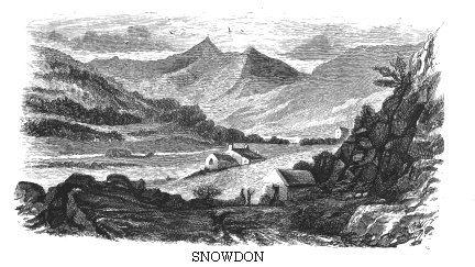 After I had descended some distance towards Beddgelert, I turned in order to take a parting farewell-look of this the mother of Cambrian mountains; and in viewing its high and lofty summit, now almost wholly enveloped in mist, I was forcibly struck with the wild, dreary, and boundless scene. From the point on which I stood this ancient hill appeared to be untrodden by human foot, and tenanted only by wandering sheep and goats, except the hoarse-croaking ravens. It was, indeed, sublime to stand, as I stood then, on that spot, and commune with solitude around—to gaze upon Snowdon and her manifold adjacent p. 17hills, slumbering calmly beneath me. With me there was no form, no human being, no living thing; but I rejoiced that there, amid this stupendous scene, I could commune freely and uninterruptedly with nature and nature’s God, and with the spirits of my brave and heroic forefathers, whose bones lie buried in that wild and dreary scene; and, as I finally parted from the scene, I sang the following well-known lines, and so my voice re-echoed through the dales and caverns:—