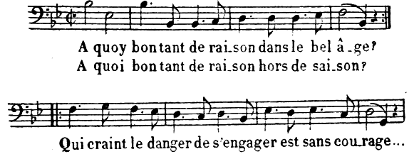 La musique en a disparu; mais les spectacles populaires, parallèles à ces représentations bourgeoises et aristocratiques, les Mai de la campagne toscane, qui se sont conservés depuis le XVe siècle jusqu’à nos jours, avec peu de changements, nous fournissent encore des indications précises sur ce que devait être ce chant primitif au théâtre. Le Mai est en stances de quatre vers de huit syllabes, rimant le premier avec le quatrième, le second avec le troisième. La musique est une cantilène perpétuelle avec quelques trilles et ornements vocaux. Le chant est lent, uniforme, d’ordinaire sans accompagnement instrumental, parfois pourtant avec violon et contrebasse. Il est dans la tonalité majeure. Le rythme est marqué par l’accentuation de la première note de chaque mesure, qui correspond à la troisième et à la septième syllabe de chaque vers. En voici un exemple, que M. Alessandro d’Ancona a eu l’obligeance de me communiquer: