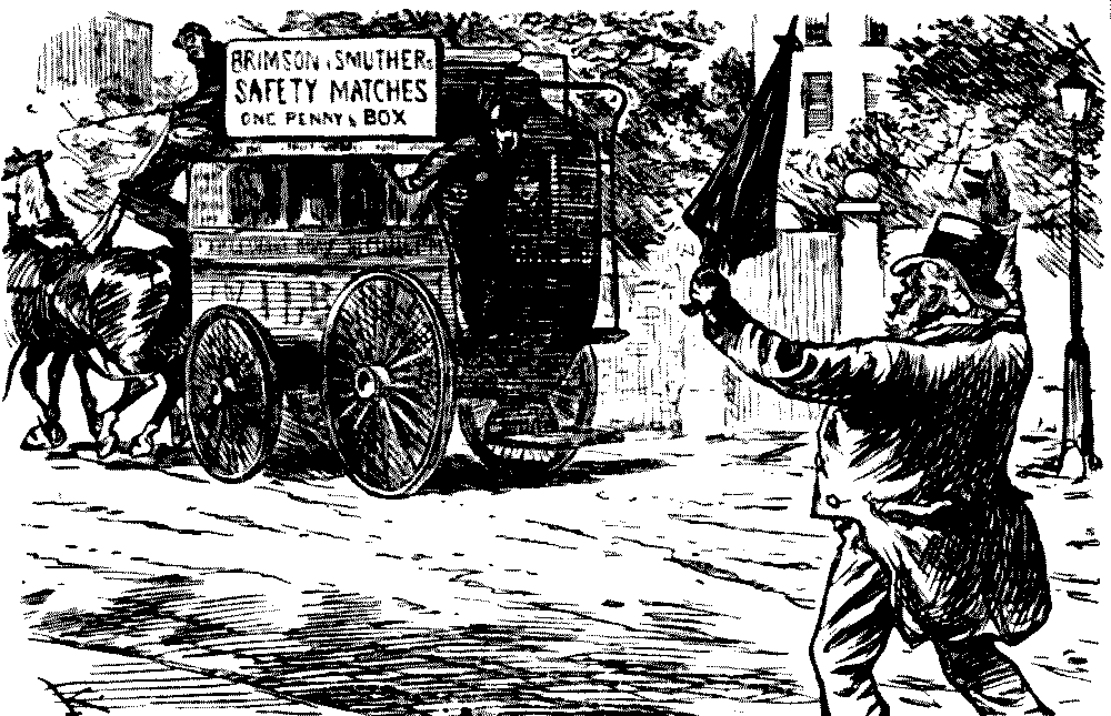 Straphanger (in first-class compartment, to first-class passenger). "I say, guv'nor, 'ang on to this 'ere strap a minute, will yer, while I get a light?"