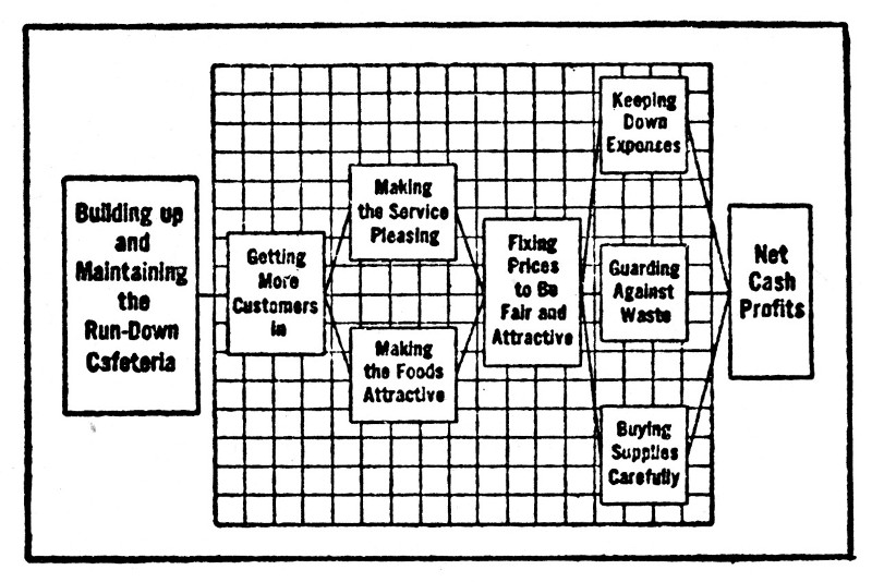 "You can score your job in pretty much the same way. All this work you're doing along cost-cutting lines is fine. Those things determine the size of your department's profits. Sketch them out on a card and check them over and add to them. But below the line put down the main object of your work—to have your invoices correct and to have them so plain that no customer can fail to understand them. Keep plugging away above the line. Don't let me discourage any effort that will reduce costs. They're all-important. But at the same time keep your eye below the line and make sure your game score is piling up. That[192] sort of thinking and playing wins in business just as it does in bridge."