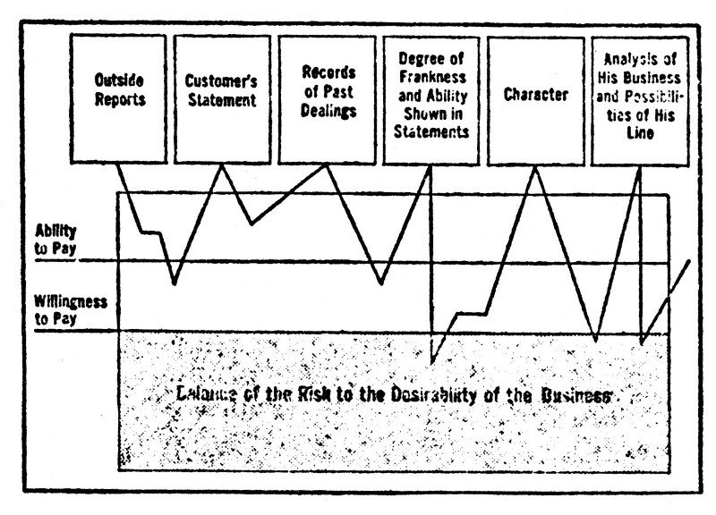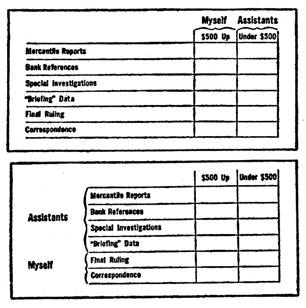 To illustrate once more, let's attempt to "score" the work of a credit man. What is the "vital element" in his work? What determines whether his work is worth doing, or whether it's worthless? Offhand, you might say: "Preventing losses on bad debts." But is it that? Surely not, when we analyze the job. The final objective of the credit department is to enable the[195] house to sell more goods by extending credit wherever it is justified. On that basis it is easy to see that the "vital element" in the credit man's job is "to not lose a good sale"—and we know we're splitting an infinitive to say it. If it weren't, why have a credit man at all? It would be far simpler not to extend credit to anyone who could not prove his worth.