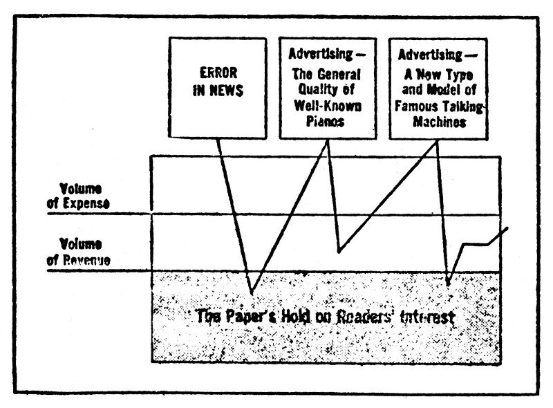 You remember he made it his business to find out all about the error in last night's paper and to prevent its occurring again. That was something which, to his way of thinking, affected the permanent standing of his paper. When the department store stood ready to start a big institutional campaign which meant nothing more to his business than a big increase in volume, he left the job of closing the contract to his hired help. But when, in another newspaper, the same department store advertised a new type of radio which he thought his readers ought to know about, once more he made it his own business to go out and[193] get a few lines for his own paper and his own readers.