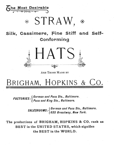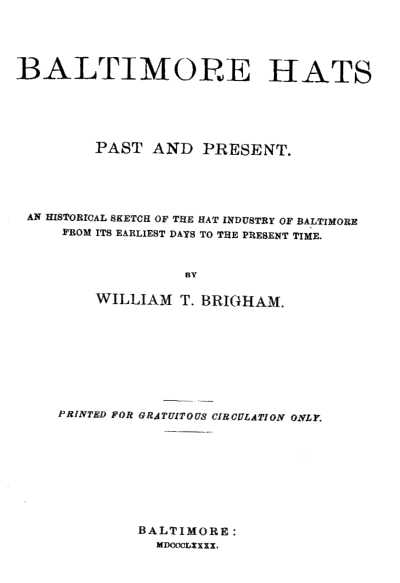 In a series of articles it is proposed to give an account of the growth of the hat manufacturing business, one of the most interesting of Baltimore's industries; how at an6 early period it was raised into conspicuous prominence in common with other enterprises undertaken in the active spirit which has always characterized Baltimore merchants as among the foremost of their time. They will also treat of its gradual growth and development, followed by a temporary decline of progress caused by the Civil War and its consequences, and finally of its triumphant stride to place itself again in line with other leading industries of this enterprising metropolis, for without doubt it holds to-day an enviable position among the different trades, a position acquired by the thoroughness, determination and perseverance of those engaged in its development.