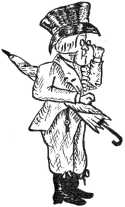 Planché, in his "Cyclopædia of Costumes" (vol. 1, page 261), quotes a humorous description, evidently referring to this particular style, as follows: "Some wear10 their hats with the corners that should cover the forehead high in the air, these are called Gawkies; others do not half cover their heads, which, indeed, is owing to the shallowness of their crowns, but between beaver and eyebrows exposes a blank forehead, which looks like a sandy road in a surveyor's plan."
