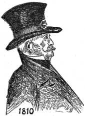 Departure from settled and accustomed styles created the same furore and astonishment, and subjected the venturesome individual whose inclinations led an advance in fashion to the same exposure to ridicule as affects the "swell" of the present day, and the reporters of "society doings" then were as close observers, as keen in wit, and as unmerciful in criticism as any of their kin to-day. Planché, quoting from the London Chronicle for 1762, refers to fashion of hats at that time as follows: "Hats," says the writer, "are now worn on the average six and three-fifths inches broad in the brim and cocked. Some have their hats open like a church spout or like the scales they weigh their coffee in; some wear them rather sharp like the nose of the greyhound, and we can designate by the taste of the hat the mood of the wearer's mind. There is a military cock and a mercantile cock, and while the beaux of St. James wear their hats under their arms, the beaux of Moorfields-Mall wear theirs diagonally over the left or right eye; sailors wear their hats uniformly tucked down to the crown, and look as if they carried a triangular apple pasty upon their heads."
