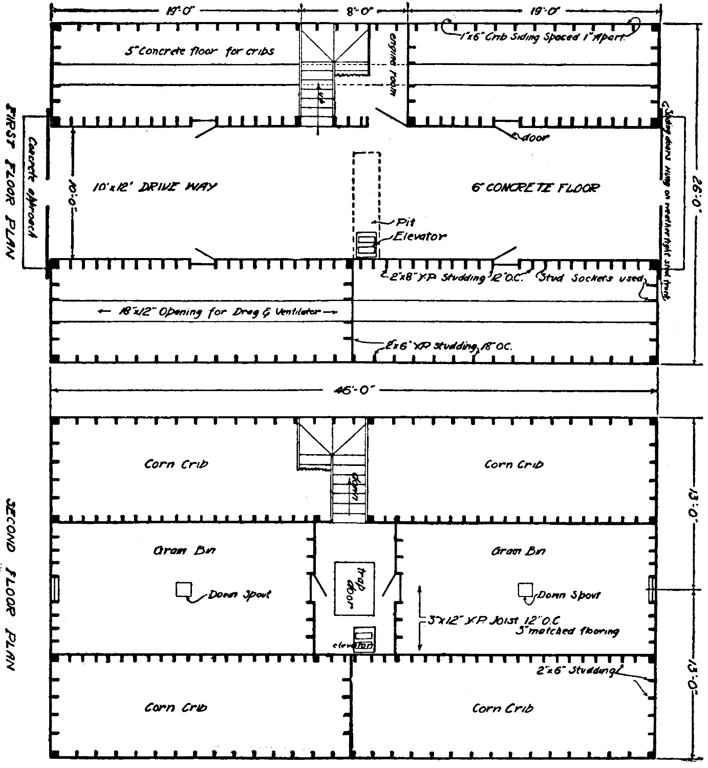 [12]The doorways provide headroom sufficient for the highest machines, and the width when the double doors are opened and the center post removed is nearly twenty feet, which is sufficient for a binder in field condition or a two-horse spring-tooth rake.