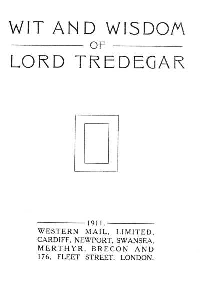 The Project Gutenberg EBook of Wit and Wisdom of Lord Tredegar, by Godfrey Charles Morgan This eBook is for the use of anyone anywhere at no cost and with almost no restrictions whatsoever. You may copy it, give it away or re-use it under the terms of the Project Gutenberg License included with this eBook or online at www.gutenberg.org Title: Wit and Wisdom of Lord Tredegar Author: Godfrey Charles Morgan Release Date: May 26, 2012 [EBook #39808] Language: English Character set encoding: ISO-8859-1 *** START OF THIS PROJECT GUTENBERG EBOOK WIT AND WISDOM OF LORD TREDEGAR *** Produced by sp1nd, Matthew Wheaton and the Online Distributed Proofreading Team at http://www.pgdp.net (This file was produced from images generously made available by The Internet Archive)