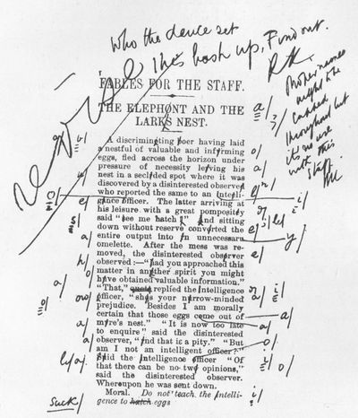 (p. 6) Lord Stanley's office was a wretched poke-hole of a room. It boasted a door with glass panels and no window. Its floor was of bare boards. Its walls were partly made of soiled plaster and partly of bare boards. Opposite the door, in the corner, stood a kitchen table which was never used, and in the other dark end of the room was another kitchen table, behind which, on a kitchen chair, the ex-Guardsman and Whip of the Unionist Party sat nearly all day, and some hours of every evening, with one hand full of manuscript and the other holding the little triangular stamp with which he printed the sign manual of his approval upon nearly every despatch which was written by those correspondents who kept within the law governing the cabling of news to their journals. A kerosene lamp, an inkpot and pen, and a litter of papers were the other appointments of the room. The censor was clad in khaki like all the rest of us, but the collar of his tunic bore on each side the short bit of red cloth which marked him as a staff officer.