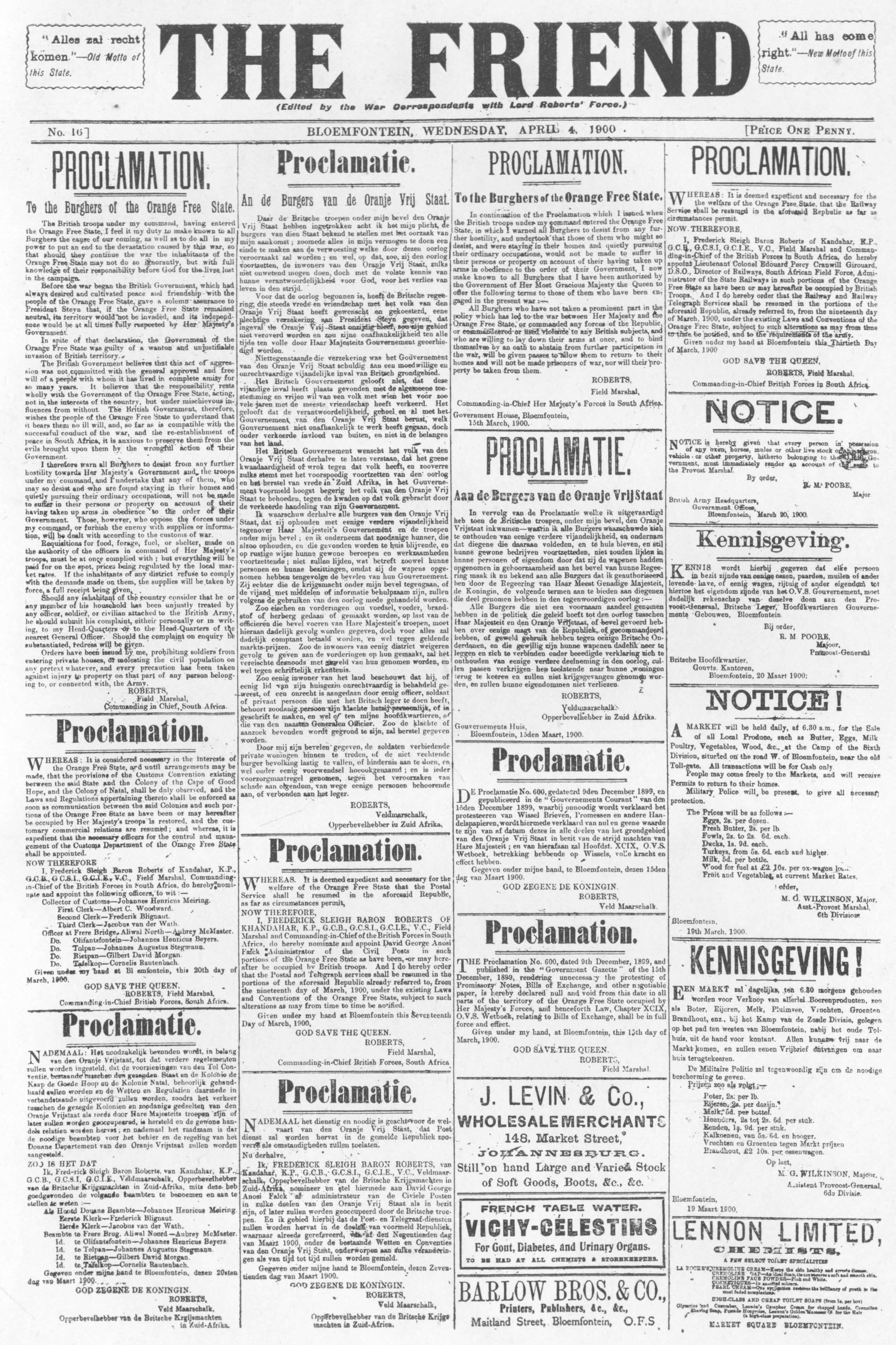 It was my first intention to reproduce all the Reading Matter which appeared in The Friend during the period in which we managed it (March 16th to April 16, 1900) but this would have formed a ponderous book of 270,000 words—without including the Military Proclamations. Such a work could not be produced for a price at the command of the general reader, and, furthermore, the general reader would have found it too tiresome to work his way through the many Technical Articles and others which time has rendered stale or of little interest. Therefore, not without regret, I felt obliged to select, as my best judgment prompted, the matter of the Most Peculiar character, or of Widest Interest for reproduction here.