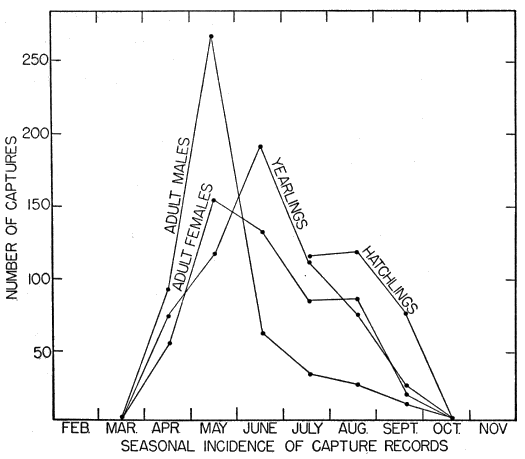 Goin and Goin (1951:29-33) have given an excellent brief account of behavior and seasonal schedule in a small colony of E. laticeps near Gainesville, Florida, based on almost daily observations over a period of years. In view of the greatly different climatic conditions, the seasonal schedule is remarkably similar to that of E. fasciatus in Kansas, and it seems that the minimum threshold temperatures required for activity are much higher in laticeps. Temperatures of 80° F. or above for several consecutive days seemed to be a necessary stimulus for emergence from hibernation; emergence was in the last week in March or the first week in April in Florida. Hatching was found to take place in late June or early July. Adults were last seen before retiring into dormancy in the latter half of September and young of the year remained active into October some two or three weeks later. The skinks observed all lived in hollow water-oaks. When the population was at an especially high level, in the late summer of 1949, each hollow oak was inhabited by one young and one adult. Territoriality and mutual exclusiveness of adults and even of young seems to be implied. The skinks were seen eating spiders, ants, and cockroaches.