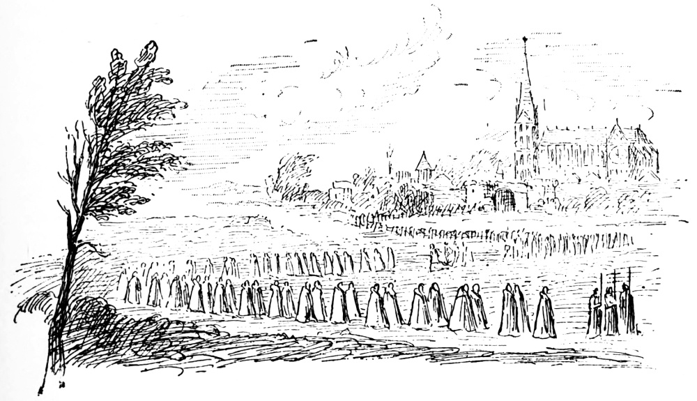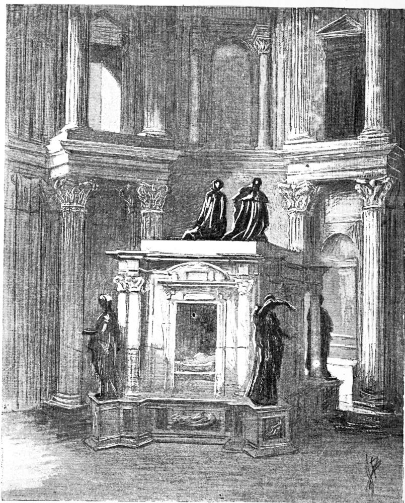 While the kings resided in the old Cité, the most brilliant ceremonies succeeded one another at the Sainte-Chapelle; it was, in fact, the chapel belonging to the adjoining palace, now the Palais de Justice. The Queens, Marie de Brabant, second wife of Philippe le Hardi; Marie de Luxembourg, second wife of Charles le Bel; Jeanne d'Evreux, third wife of the same Prince; and Isabelle de Bavière, wife of Charles VI., were all crowned there. The marriage of the Emperor, Henri VII. and Marguerite de Brabant, and the betrothal of Isabeau, eldest daughter of Charles VI. with Richard II. of England, were also solemnised in the chapel. There, in 1332, Philippe de Valois held a great assembly of prelates and barons, to announce his project of another crusade against the Infidels—a project which was never carried out. On the feast of the Epiphany, 1378, King Charles V., the Emperor Charles IV., and his son Wenceslas, King of the Romans, offered gold, frankincense and myrrh, after the manner of the three holy Magi. Every time that the sovereigns convoked an assemblage of the clergy in the palace, the prelates first went to the chapel and asked the blessing of the Holy Spirit, while prostrated before the relics. In 1483, when Louis XI. was lying ill at Tours, he hoped to prolong his life by surrounding himself with the most sacred relics of his kingdom—so reluctant was this devôt to depart from our wicked world. The Sainte Ampoule was brought by the religious of S. Remi from Reims; the canons of the Sainte-Chapelle took the Cross of Victory and the Rod of Moses out of their treasury, and a grand procession of clergy and laity was formed on the 1st of August to carry them from Paris to Plessis-les-Tours. But, alas! to no end; for on the 30th of the same month the poor creature finished his earthly career of hypocrisy.
