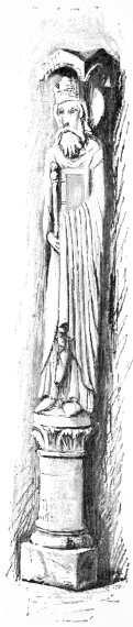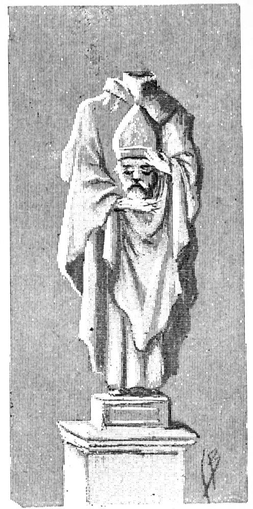 Not only was S. Denis specially favoured by this miraculous dedication, but it was privileged by Charlemagne in a charter, as the chief and mistress of all the churches in the kingdom; and its abbot as the Primate of all the prelates of France. This great man was allowed to have six deacons vested in dalmatics whenever he officiated, an honour conferred upon him by Pope Stephen III. when he consecrated the High Altar in 753, and at the same time anointed and crowned King Pépin and Queen Bertrade, and their two sons Charles and Carloman. People, high and low, from all the ends of the earth, flocked to the famous abbey as we now rush to the World's Fairs; and the great ones of the earth, princes, nobles, and ambassadors, considered that they had seen nought of the civilised world if they had not paid their respects to the relics at S. Denis. Some went for love, some out of sheer curiosity to see the riches of the treasury: divers crosses, reliquaries, statues, vases, chalices, and other vessels for the altars; S. Denis' mitre, chalice, and rings; the famous head of solid silver gilt, containing his skull, and presented to the abbey by Marguerite de France in 1360; a wonderful golden cup enriched with precious stones which had belonged to King Solomon, and a rock crystal vase from the Temple of the wise man—both the gift of Charles the Bald. He, being abbot, made it his custom to attend "the duties of his station at the Abbaye, on the solemn festivals, passing the day in pious conversation with the monks and in religious observances." He also made considerable donations,[10] added to the many lamps which are kept continually burning before the shrines, and increased the number of wax tapers employed in the services of the church. Then further, amongst the curiosities, were the nail of a griffin upon a silver-gilt animal; a unicorn's horn six feet high, sent by Aaron King of Persia to Charlemagne; the hunting horn of Roland, nephew of Charlemagne; and the lantern which was used at the betrayal of our Lord in the Garden, called the Lantern of Judas. The latter was of copper, embellished by rock crystal, through which the light shone. (This was also the gift of Charles the Bald). The mirror of the prince of poets, Virgil, which was of jet; the sword of the genereuse Amazone, Jeanne la Pucelle. Of the beauty of the croziers and pastoral crosses, the mitres and episcopal rings, Dom Millet's description leaves no doubt; and of the magnificence of the abbots, and the splendour of their monastery, we have more than ample evidence. As an old epigram puts it: