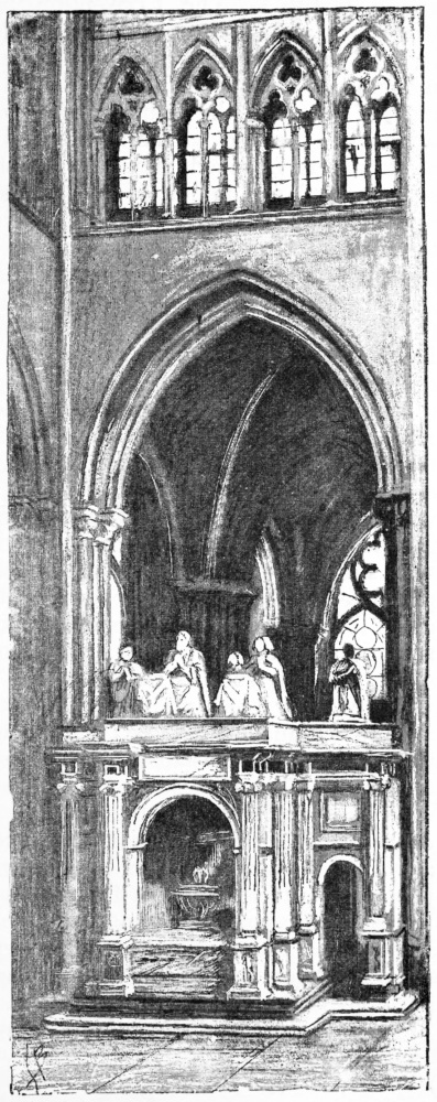 The most important event of the 13th century connected with the Sainte-Chapelle was the translation of some of S. Louis' bones from S. Denis, in which church they had been laid twenty-seven years previously upon their arrival from Tunis, where the king had died of fever on the 25th August, 1270. Feeling his last moments to have arrived, he caused his body to be placed upon a bed of ashes, and wearing the habit of the third order of S. Francis, his noble spirit passed away. He was embalmed, according to the fashion of the day; or rather, his bones were relieved of their outer casements, by boiling in wine and water; other parts of his body, which it is unnecessary to specify, being given by his son to the King of Sicily, who placed them in the church of Monreale, Palermo. The young Comte de Nevers had died just before S. Louis; and Alfonso de Brienne, Comte d'Eu, son of John de Brienne, King of Jerusalem, and the Chevalier Pierre, the King's chamberlain, had also succumbed to the unhealthy climate. The funeral procession set out, and wended its way towards France under the care of S. Louis' son, Philippe le Hardi. Arriving at Paris, the bodies were placed temporarily in Notre-Dame on the 21st of May; and the next day, amidst a large concourse of people, the procession, consisting of clergy, and religious, started early for S. Denis, Philippe, reverently bearing his father's bones, walking like the rest. Up through the city they went, singing and chanting, and taking much the same route as had been traversed by S. Denis and his companions, after their martyrdom, as recorded by the old chroniclers. In an engraving by Boulogne a long procession of monks and knights is seen issuing from the abbey to meet another coming from Paris, the king and bishops being dressed in that peculiar high wind-blown drapery common to pictorial art in the 17th and 18th centuries. S. Louis' bones were placed in a stone coffin and buried in front of the altar of the Holy Trinity, near the resting place of the bodies of Louis VIII. and Philippe Auguste. Philippe le Hardi's wife, Isabelle, and Tristan, Comte de Nevers, were placed on the right; the chevalier Pierre, who, as chamberlain, had the privilege of sleeping in the King's chamber, was laid at his feet. In 1292, Henri de Luxembourg caused the relics to be placed in a silver shrine and conveyed to the Sainte-Chapelle by the Archbishops of Reims and Lyon; but after some days they were returned to S. Denis, and it was not until 1306 that Philippe le Bel succeeded in his desire of placing the remains of his grandfather in the chapel which was so dear to him, that he felt a malaise each time he heard the divine offices elsewhere. The Bull of canonization was promulgated by Pope Boniface VIII. in 1297, and the translation of the king's skull followed nine years later, accompanied by all the picturesque pomp of the 14th century. The reliquary was in the form of a gold bust of natural size, enriched with precious stones, and supported by Angels upon a pedestal which rested upon four silver-gilt lions. The crown and the collar of the vestment were decorated with rubies, pearls, emeralds, and sapphires; and around the socle were representations of the twenty-nine kings of France, and a Latin inscription giving the date of the work, and the name of the smith, Master Guillaume Juliani. Such was the châsse which enclosed the principal relic of S. Louis: "Afin que la présence du Chef de ce grand roi, qui pendant sa vie avait eu la justice en singulière recommandation, animat les Juges de ce Parlement à maintenir les loix, protéger les gens du bien, rendre la justice à ses sujets sans exception de personne."[3]