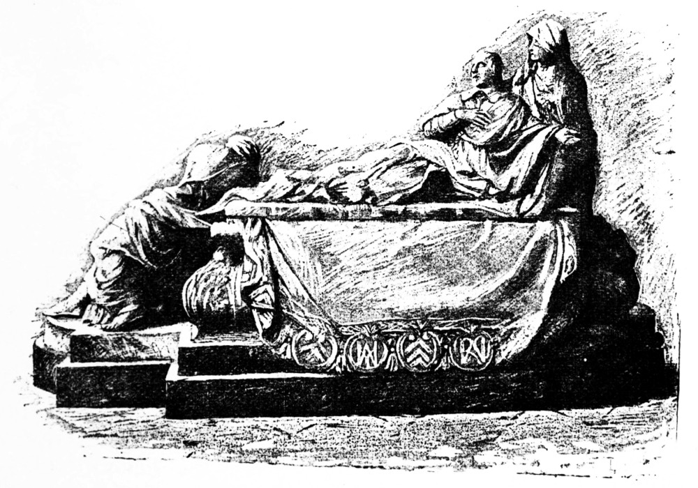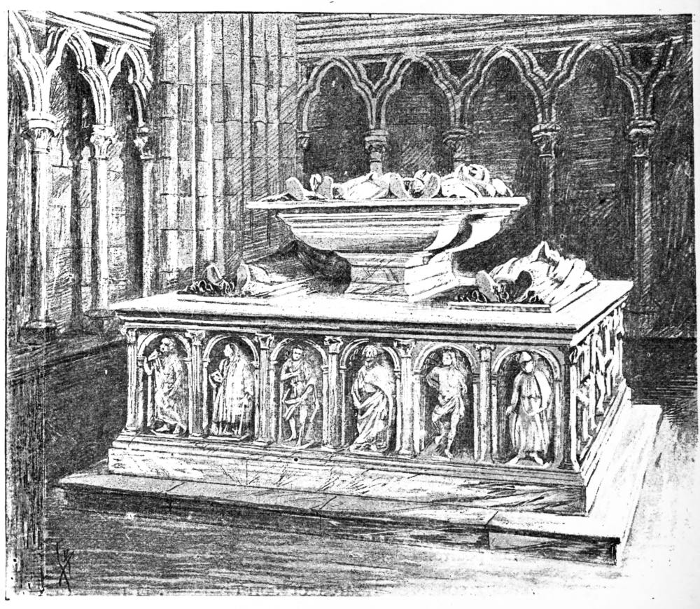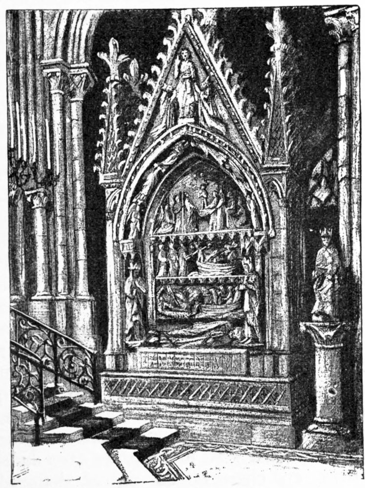 Another stone recorded the name of his wife Agnes, and on that he is termed, in old French, mestre Pierre de Montereul. The chapel has disappeared, and with it all trace of the tombs; but one at Reims, erected in honour of Hugues Libergier, architect of the celebrated abbey church of S. Nicaise, who died in 1263, gives some idea of what those of Pierre de Montereau and his wife must have been.