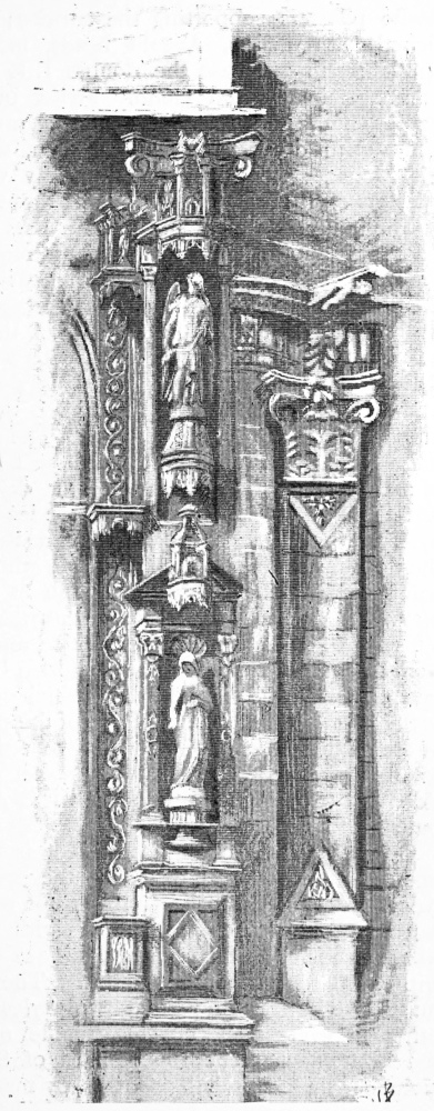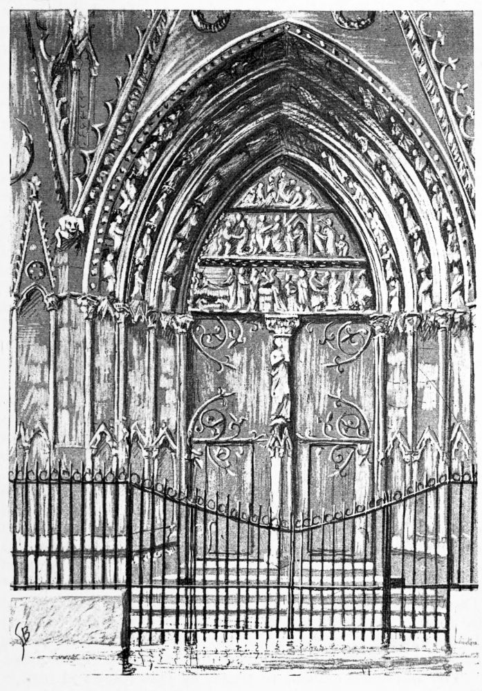 The porch of the lower chapel is divided into two bays by a pier, on which is a statue of the Blessed Virgin, while above in the tympanum, is a representation of the Coronation of the Virgin. The restoration of this and the entire ornament of the doorway is the work of M. Geoffroy-Dechaume. The original statue had the reputation of working miracles; and it is related that when, towards 1304, Jean Duns Scotus, a celebrated theologian of the University of Paris, was praying at its feet, it bent its head in approval of the doctrine of the Immaculate Conception, which that learned doctor was teaching. It has since always remained in the same position. The portal of the upper chapel is of the same character as the lower one, but richer in its decoration. It is nearly all new, for the old ornament had not only been mutilated, but had been completely chiselled off. The voussure is a mass of sculptures—single figures, groups, and ornament. The figures are forty-four in number: Angels carrying the elect to heaven, Angels censing and bearing crowns, martyrs with the instruments of their sufferings, and the lost souls surrounded by the flames of hell, the whole forming a framework to the central subject in the tympanum, the Last Judgement; the work is a marvel of patient study, modelled upon the portals of Notre-Dame and S. Germain l'Auxerrois, each figure having been fitted into its place upon the lines of the original wherever any traces of the old sculptures had been preserved.