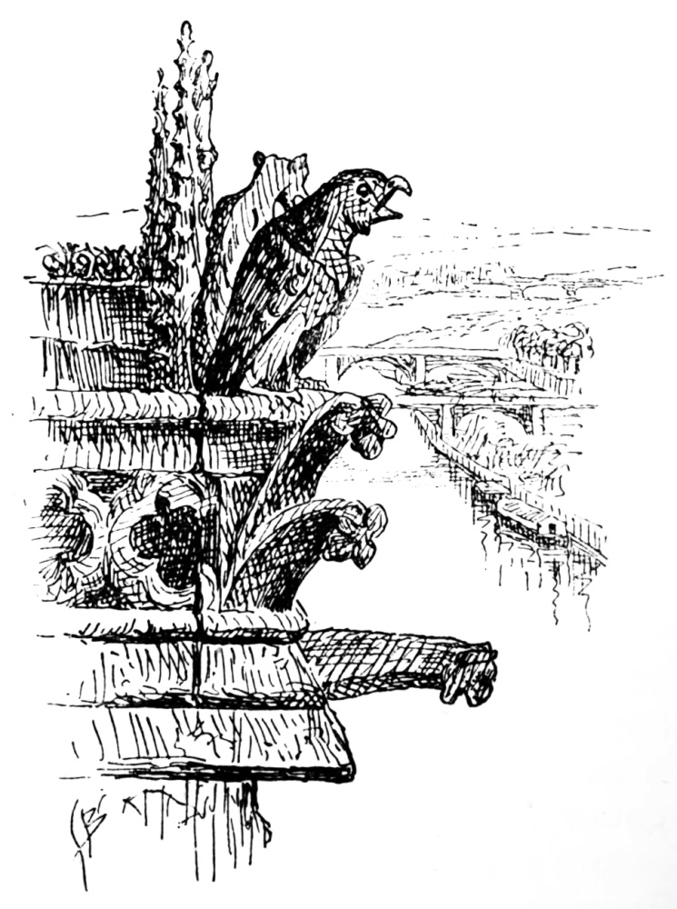 On the lower storey are colossal statues of the twelve Apostles, most of them portraits, the S. Thomas being that of the sculptor Lassus. The gables of the upper storey support Angels with the instruments of the Passion. The crockets of the spire are fleurs-de-lys, and the whole is resplendent with gilding. The summit of the chevet is surmounted by a huge Angel, in lead, holding a processional cross. There was an idea, never carried out, of making this statue turn round mechanically upon a pivot during the twenty-four hours, that it might present the symbol of salvation successively to all quarters of the city. The masks upon the pedestal of this figure are all portraits of the artists and workmen engaged upon the restoration of the chapel, posing as the Kings of France. The oratory, erected by Louis XI., between the two buttresses of the fourth bay, upon the south side, is decorated with niches and corbels of human heads.