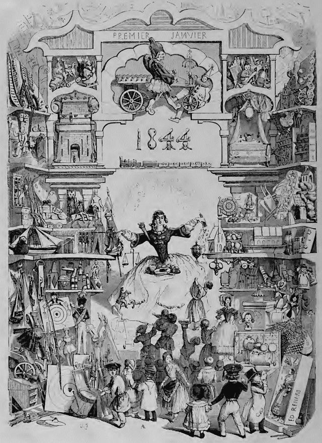 Ouverture de la Session de 1843. Cortège royal; Arrivée du Roi dans la cour du Palais-Bourbon; Discours d'ouverture,--Oraison funèbre de 1843, Neuf Gravures, par Bertal.--Le Jour de l'An en Europe. Un Lever de la reine d'Angleterre; la Bénédiction de la Newa; la Polonaise à la cour de Russie; Baisers du Jour de l'An, par Grandville.--Le Jour de l'An en Chine. Une Carte chinoise.--L'Origine des Étrennes.--Les Petits Bonheurs du Jour de l'An. Le Palais de la Nouvelle Année, par Grandville.--Les Petites Misères du Jour de l'An. Vingt Gravures, par Cham.--Éphémérides du Jour de l'An.--Modes de 1844, par Grandville.--Rébus.