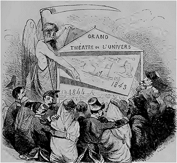 Au même moment où le Tempséteint l'année 1843, il allume du bout de la faux l'année 1844, bougie toute neuve qui s'élance fièrement de son chandelier, mèche au vent, en attendant qu'elle brûle à petit feu, comme tant d'autres, et se fonde. Superbe allégorie qui fait voir que le temps reconstruit d'une main ce qu'il détruit de l'autre!