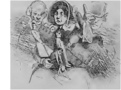 Nous voudrions de grand cœur donner ici le texte même de l'ouvrage, à ceux de nos charmants abonnés qui ne le connaissent point encore; malheureusement, ou n'a pas jusqu'ici découvert le moyen du faire tenir dix volumes in-8 dans un alinéa; cela viendra plus tard; en attendant, offrons aux impatients le portrait des principaux personnages qui figurent dans le roman de M. Eugène Sue. Le visage étant le miroir de l'âme, en voyant les héros, c'est comme si on lisait le livre; nous garantissons la ressemblance, jusqu'à la fin de la semaine prochaine. Le premier portrait, placé à gauche, vous représente le Maître d'école; un devine aisément à sa mine peu avenante, et ses doigts crochus, au manche de poignard qui s'allonge sur sa poitrine, que le drôle est un scélérat fieffé.--A côté de lui, voici la Goualeuse, ou plutôt Fleur de Marie, comme l'indiquent son attitude naïve et repentante, et ce bouquet de coquelicots et de bluets qui fleurit dans un pot, derrière elle.