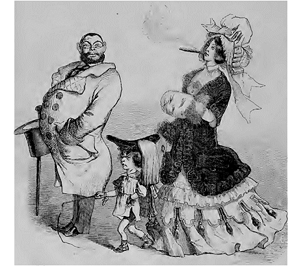 Dans ce tableau mémorable, le Temps attire d'abord l'attention et occupe la plus grosse place. A tout seigneur tout honneur. Ou peut, au premier coup d'œil, trouver que son costume n'est pas taillé sur le patron de la dernière mode, mais il faut convenir du moins qu'il est irréprochable sous le point de vue classique. Hésiode, Homer, Virgile, Ovide, n'y trouveraient pas le plus petit mot à redire, et les Staubs du vieil Olympe lu donneraient à coup sur leur approbation. Rien n'y manque, ni les ailes, ni la faux.. Vous remarquerez d'ailleurs que Saturne pactise du côté de la barbe avec les merveilleux du jour. C'est un lion par la moustache. Le Café de Paris n'a pas son égal.--Son visage ne rappelle pas le velouté de la pèche ni la fraîcheur de la rose, je le confesse; c'est que le Temps n'est pas né d'hier; il existait déjà que rien n'était encore; le Temps est le vieux des vieux, et vraiment il y aurait de l'injustice à lui demander des airs d'adolescent.--Que ses jambes sont grêles!--Eh! mes amis, il n'en marche pas moins vite, vous ne le savez que trop, ô vous qu'il emporte sans cesse et sans repos, d'heure en heure, de minute en minute, de seconde en seconde, plaisir, jeunesse, gloire, amour, génie, beauté.