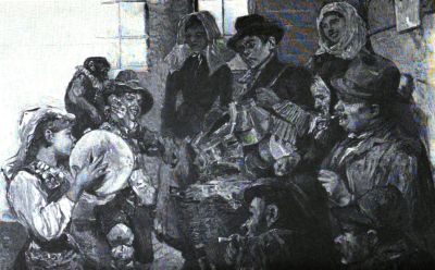 It is in Illinois that I know his family best. Cavalier John, as he proudly called himself, I remember particularly. He gave me shelter one night in his wagon, as I was toiling along the highway south of Ottawa,[Pg 31] and we became such good friends that I traveled with his caravan for three days. And what a caravan it was! A negro wife, five little mulattoes, a deformed white girl, three starved dogs, a sore-eyed cat, a blasphemous parrot, a squeaking squirrel, a bony horse, and a canvas-topped wagon, and all were headed "Texas way." John came from Maine originally, but he had picked up his wife in the West, and it was through their united efforts in trickery and clever trading that they had acquired their outfit. So far as I could learn, neither of them had ever done an honest stroke of business. The children ranged from three years to fourteen, and the deformed girl was nearly twenty. John found her among some other ambulanters in Ohio, and, thinking that he might make money out of her physical monstrosities as "side-shows," cruelly traded off an old fox for her. She ought to have been in an insane asylum, and I hope John has put her there long ago. The other "kidlets," as they were nicknamed, were as deformed morally as was the adopted girl physically. They had to beg in every town and village they came to, and at night their father took the two oldest with him in his raids on the hen-roosts. It was at town and county fairs, however, that they were the most profitable. Three knew how to pick pockets, and the two youngest gave acrobatic exhibitions. None of them had ever been in school, none could read or write, and the only language they spoke was the one of their class. I have never been able to learn it well, but it is a mixture of Rom and tramp dialects with a dash of English slang.