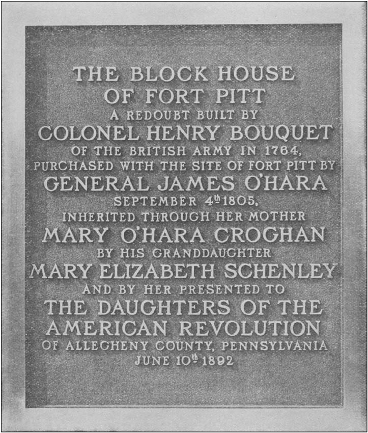 April 1, 1894.—Mrs. Mary E. Schenley, granddaughter of Gen. James O'Hara, presents Col. Bouquet's Redoubt to the Daughters of the American Revolution of Allegheny County, Pennsylvania.