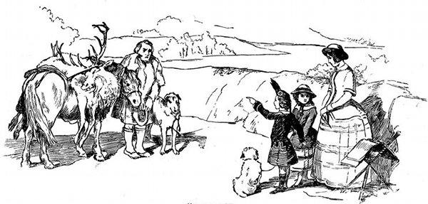 Sir Edwin Landseer—who painted the picture—was at the time in Scotland giving lessons to the Queen. Whilst on his way to Balmoral he wandered in the direction of Loch Laggan, and became perplexed as to which path to take. Espying the Highlander, he bade him hasten to find the Queen, and say that Sir Edwin would reach her ere long. The man needed no second bidding, and jumped on the pony's back. He had not proceeded far round the lake before he drew up his pony in front of a lady, who was sketching, whilst her two [pg 234] children were busying themselves by handing her the various drawing implements as required.