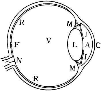 I am not going to attempt a detailed description of the human eye. It will be sufficient to point out briefly some of[Pg 24] its principal features as indicated in the annexed diagrammatic section, Fig. 2.