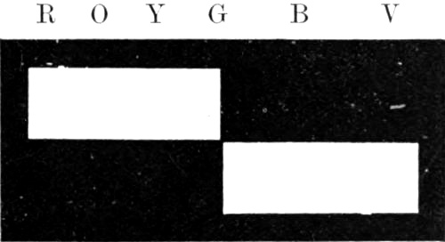 The two ends of the spectrum gradually fade away into darkness, and the point that I wish to insist upon and make perfectly clear is this:—The position of the boundaries terminating the visible spectrum does not depend upon anything whatever in the nature of light regarded as a physical phenomenon. Ether waves which are much longer and much shorter than those which illuminate the spectrum certainly exist, and evidence[Pg 14] of their existence is easily obtainable. But we cannot see them; they fall upon our eyes without exciting the faintest sensation of light. The visible spectrum is limited solely by the physiological constitution of our organs of vision, and the fact that it begins and ends where it does is, from a physical point of view, a mere accident. The spectrum actually projected upon the screen is in truth much longer than that portion of it which any one can see: it extends for a considerable distance beyond the violet at the one end and beyond the red at the other, these invisible portions being known as the ultra-violet and infra-red regions. People’s eyes differ in regard to range of sensibility just as their ears do. I believe the sensibility of my own eyes to be normal, but if I were[Pg 15] to indicate the two points where the spectrum appears to me to begin and to end, a great many persons would certainly be inclined to disagree with me and place the boundaries somewhere else. Some, indeed, could see nothing whatever in what appears to most of us to be a brilliant portion of the red.