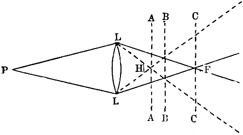 In man and the higher animals the optical apparatus, or eye, consists of a stiff globular shell, having in front an[Pg 23] opening provided with a system of lenses, and, at the back of the interior, a delicate perceptive membrane, upon which the transmitted light is received. So much of the light emitted or reflected from an external object as passes through the lenses, is distributed by them in such a manner as to form what is called an “image” upon the membrane, every elementary point of the image receiving the light which issues from a corresponding point of the object, and no other. The contrivance evidently bears a close resemblance to a photographic camera, the sensitive plate or film, upon which the picture is projected, being analogous to the perceptive membrane.