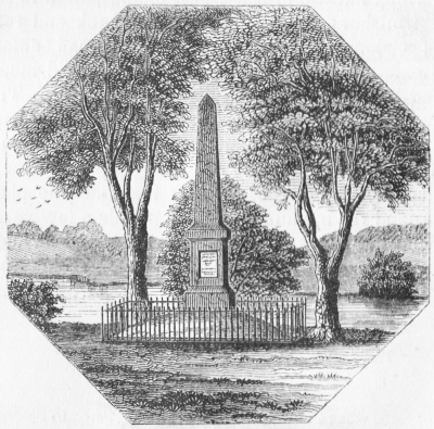 The road between Concord and Lexington passes through a hilly but fertile country. It is easy for the traveler to conceive how terribly a retreating army might be galled by the fire of a concealed enemy. Hills and hillocks, some wooded, some bare, rise up every where, and formed natural breast-works of protection to the skirmishers that hung upon the flank and rear of Colonel Smith's troops. The road enters Lexington at the green whereon the old meeting-house stood when the battle occurred. The town is upon a fine rolling plain, and is becoming almost a suburban residence for citizens of Boston. Workmen were inclosing the Green, and laying out the grounds in handsome plats around the monument, which stands a few yards from the street. It is upon a spacious mound; its material is granite, and it has a marble tablet on the south front of the pedestal, with a long inscription.[3] The design of the monument is not at all graceful, and, being surrounded by[Pg 723] tall trees, it has a very "dumpy" appearance. The people are dissatisfied with it, and doubtless, ere long, a more noble structure will mark the spot where the curtain of the revolutionary drama was first lifted.