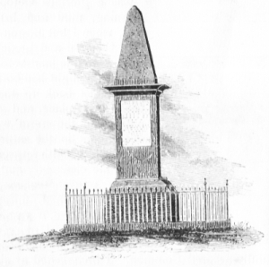 From Major Barrett's we rode to the monument erected at the site of the old North Bridge, where the skirmish took place. The road crosses the Concord River a little above the site of the North Bridge. The monument stands a few rods westward of the road leading to the village, and not far from the house of the Reverend[Pg 722] Dr. Ripley, who gave the ground for the purpose. The monument is constructed of granite from Carlisle, and has an inscription upon a marble tablet inserted in the eastern face of the pedestal.[2] The view is from the green shaded lane which leads from the highway to the monument, looking westward. The two trees standing, one upon each side, without the iron railing, were saplings at the time of the battle; between them was the entrance to the bridge. The monument is reared upon a mound of earth a few yards from the left bank of the river. A little to the left, two rough, uninscribed stones from the field mark the graves of the two British soldiers who were killed and buried upon the spot.
