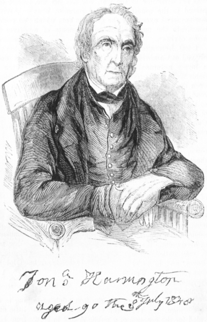 I next called upon the venerable Abijah Harrington, who was living in the village. He was a lad of fourteen at the time of the engagement. Two of his brothers were among the minute men, but escaped unhurt. Jonathan and Caleb Harrington, near relatives, were killed. The former was shot in front of his own house, while his wife stood at the window in an agony of alarm. She saw her husband fall, and then start up, the blood gushing from his breast. He stretched out his arms toward her, and then fell again. Upon his hands and knees he crawled toward his dwelling, and expired just as his wife reached him. Caleb Harrington was shot while running from the meeting-house. My informant saw almost the whole of the battle, having been sent by his mother to go near enough, and be safe, to obtain and convey to her information respecting her other sons, who were with the minute men. His relation of the incidents of the morning was substantially such as history has recorded. He dwelt upon the subject with apparent delight, for his memory of the scenes of his early years, around which cluster so much of patriotism and glory, was clear and full. I would gladly have listened until twilight to the voice of such experience, but time was precious, and I hastened to East Lexington, to visit his cousin, Jonathan Harrington, an old man of ninety, who played the fife when the minute men were marshaled on the Green upon that memorable April morning. He was splitting fire-wood in his yard with a vigorous hand when I rode up; and as he sat in his rocking-chair, while I sketched his placid features, he appeared no older than a man of seventy. His brother, aged eighty-eight, came in before my sketch was finished, and I could not but gaze with wonder upon these strong old men, children of one mother, who were almost grown to manhood when the first battle of our Revolution occurred! Frugality and temperance, co-operating with industry, a cheerful temper, and a good constitution, have lengthened their days, and made their protracted years hopeful and happy.[5] The aged fifer apologized for the[Pg 724] rough appearance of his signature, which he kindly wrote for me, and charged the tremulous motion of his hand to his labor with the ax. How tenaciously we cling even to the appearance of vigor, when the whole frame is tottering to its fall! Mr. Harrington opened the ball of the Revolution with the shrill war-notes of the fife, and then retired from the arena. He was not a soldier in the war, nor has his life, passed in the quietude of rural pursuits, been distinguished except by the glorious acts which constitute the sum of the achievements of a GOOD CITIZEN.