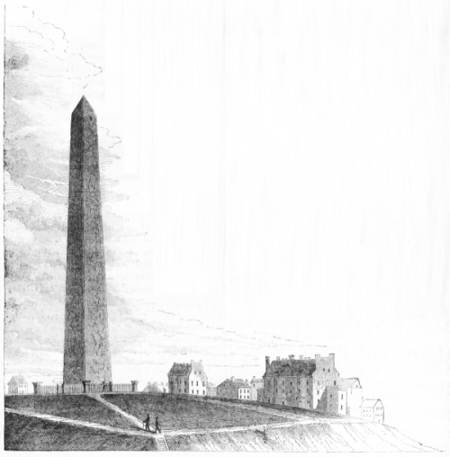 Early on the following morning I procured a chaise to visit Charlestown and Dorchester Heights. I rode first to the former place, and climbed to the summit of the great obelisk that stands upon the site of the redoubt upon Breed's Hill. As I ascended the steps which lead from the street to the smooth gravel-walks upon the eminence whereon the "Bunker Hill Monument" stands, I experienced a feeling of disappointment and regret, not easily to be expressed. Before me was the great memento, huge and grand—all that patriotic reverence could wish—but the ditch scooped out by Prescott's toilers on that starry night in June, and the mounds that were upheaved to protect them from the shots of the astonished Britons, were effaced, and no more vestiges remain of the handiwork of those in whose honor and to whose memory this obelisk was raised, than of Roman conquests in the shadow of Trajan's column—of the naval battles of Nelson around his monument in Trafalgar-square, or of French victories in the Place Vendôme. The fosse and the breast-works were all quite prominent when the foundation-stone of the monument was laid, and a little care, directed by good taste, might have preserved them in their interesting state of half ruin until the passage of the present century, or, at least, until the sublime centenary of the battle should be celebrated. Could the visitor look upon the works of the patriots themselves, associations a hundred-fold more interesting would crowd the mind, for wonderfully suggestive of thought[Pg 727] are the slightest relics of the past when linked with noble deeds. A soft green sward, as even as the rind of a fair apple, and cut by eight straight gravel-walks, diverging from the monument, is substituted by art for the venerated irregularities made by the old mattock and spade. The spot is beautiful to the eye untrained by appreciating affection for hallowed things; nevertheless, there is palpable desecration that may hardly be forgiven.
