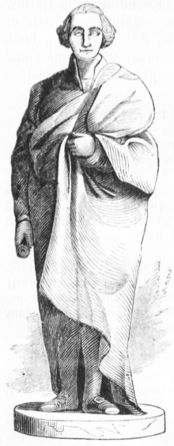 Near Mr. Hancock's residence is the State House, a noble structure upon Beacon Hill, the corner-stone of which was laid in 1795, by Governor Samuel Adams, assisted by Paul Revere, master of the Masonic grand lodge. There I sketched the annexed picture of the colossal statue of Washington, by Chantrey, which stands in the open centre of the first story; also the group of trophies from Bennington, that hang over the door of the Senate chamber. Under these trophies, in a gilt frame, is a copy of the reply of the Massachusetts Assembly to General Stark's letter, that accompanied the presentation of the trophies. It was written fifty years ago.