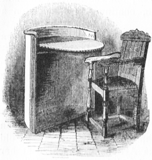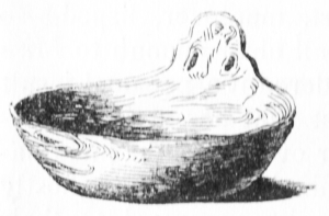 I had the pleasure of meeting, at the rooms of the society, that indefatigable antiquary, Dr. Webb, widely known as the American correspondent of the "Danish Society of Northern Antiquarians" at Copenhagen. He was sitting in the chair that once belonged to Governor Winthrop, writing upon the desk of the speaker of the Colonial Assembly of Massachusetts, around which the warm debates were carried on concerning American liberty, from the time when James Otis denounced the Writs of Assistance, until Governor Gage adjourned the Assembly to Salem, in 1774. Hallowed by such associations, the desk is an interesting relic. Dr. Webb's familiarity with the collections of the society, and his kind attentions, greatly facilitated my search among the six thousand articles for things curious connected with my subject and made my brief visit far more profitable to myself than it would otherwise have been. Among the relics preserved are the chair that belonged to Governor Carver; the sword of Miles Standish; the huge key of Port Royal gate; a samp-pan, that belonged to Metacomet, or King Philip; and the sword reputed to have been used by Captain Church when he cut off that unfortunate sachem's head. The dish is about twelve inches in diameter, wrought out of an elm knot with great skill. The sword is very rude, and was doubtless made by a blacksmith of the colony. The handle is a roughly-wrought piece of ash, and the guard is made of a wrought-iron plate.