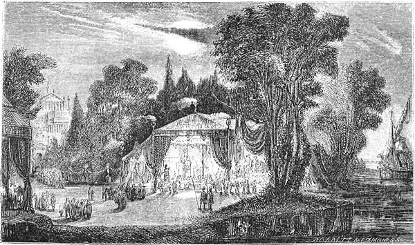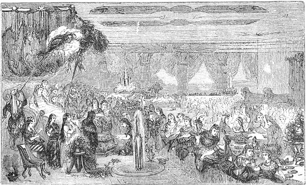 After some little time had elapsed, and Cleopatra was beginning to be well established in her possession of the supreme power at Alexandria, her birth-day approached, and arrangements were made for celebrating it in the most magnificent manner. When the day arrived, the whole city was given up to festivities and rejoicing. Grand entertainments were given in the palace, and games, spectacles, and plays in every variety, were exhibited and performed in all quarters of the city. Cleopatra herself was enjoying a magnificent entertainment, given to the lords and ladies of the court and the officers of her army, in one of the royal palaces.