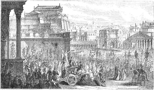 This supposition in respect to the mode of her death is, in fact, confirmed by the action of Octavius himself on his return to Rome, which furnishes a strong indication of his opinion of the manner in which his captive at last eluded him. Disappointed in not being able to exhibit the queen herself in his triumphal train, he caused a golden statue representing her to be made, with an image of an asp upon the arm of it, and this sculpture he caused to be borne conspicuously before him in his grand triumphal entry into the capital, as the token and trophy of the final downfall of the unhappy Egyptian queen.