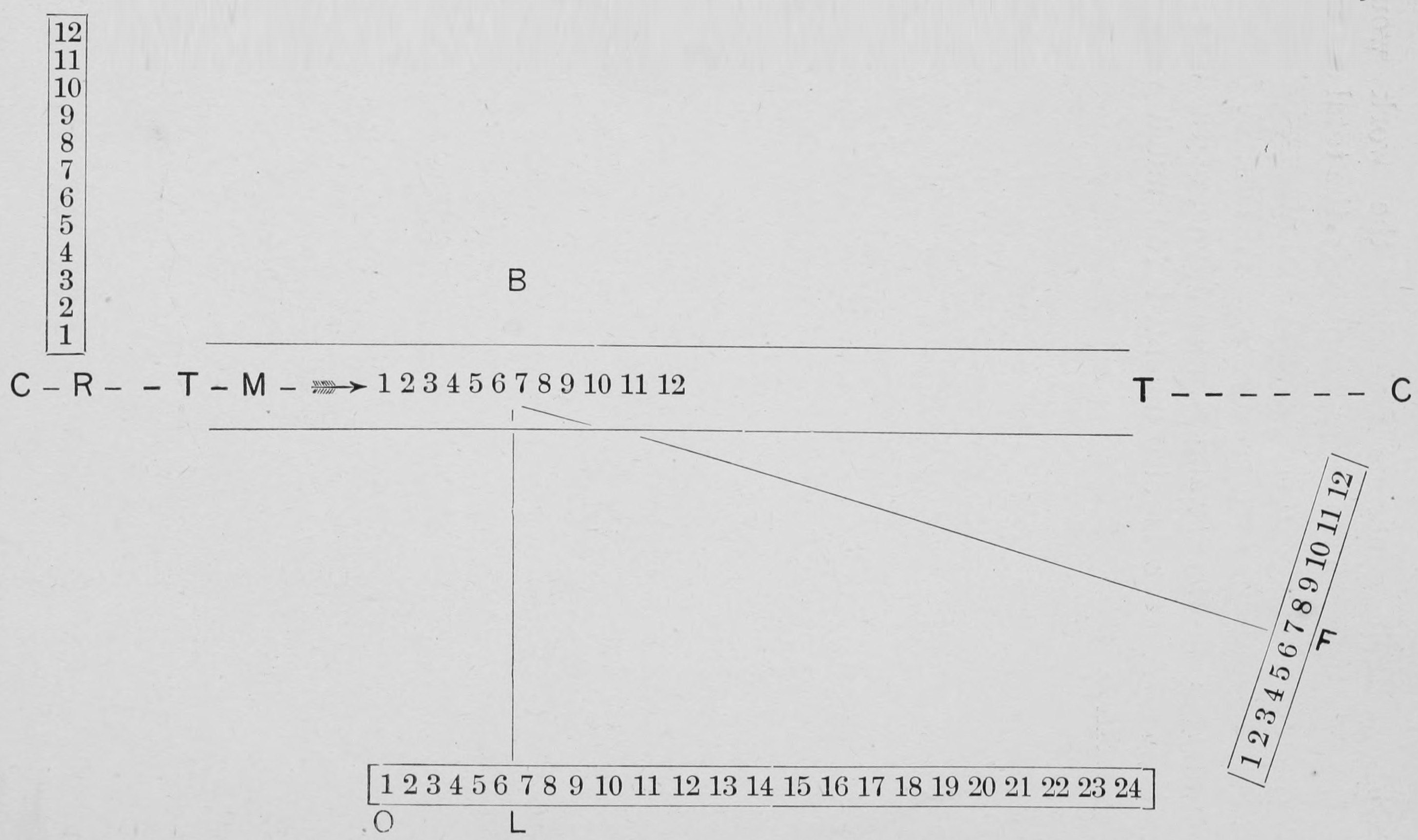 F. A battery of 12 automatic electro-photographic cameras, similar to that placed at R, arranged horizontally for "Front Foreshortenings," the points of view averaging an angle of 60 degrees from the lateral battery.