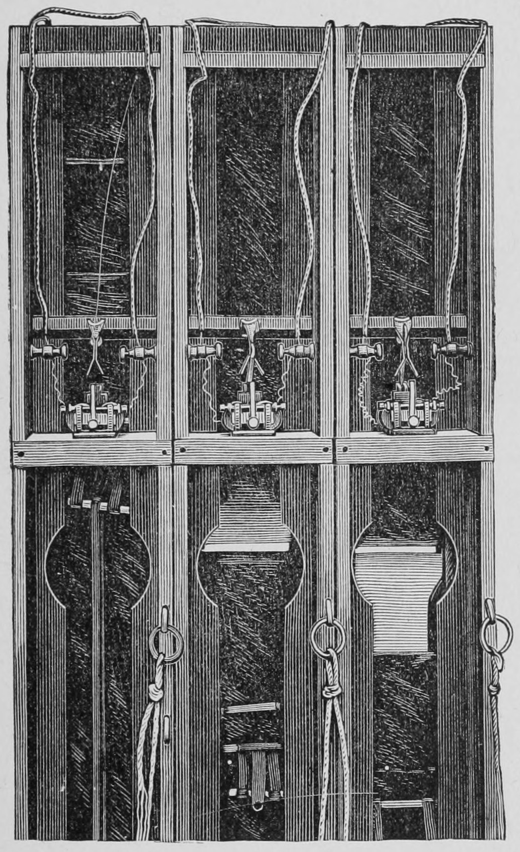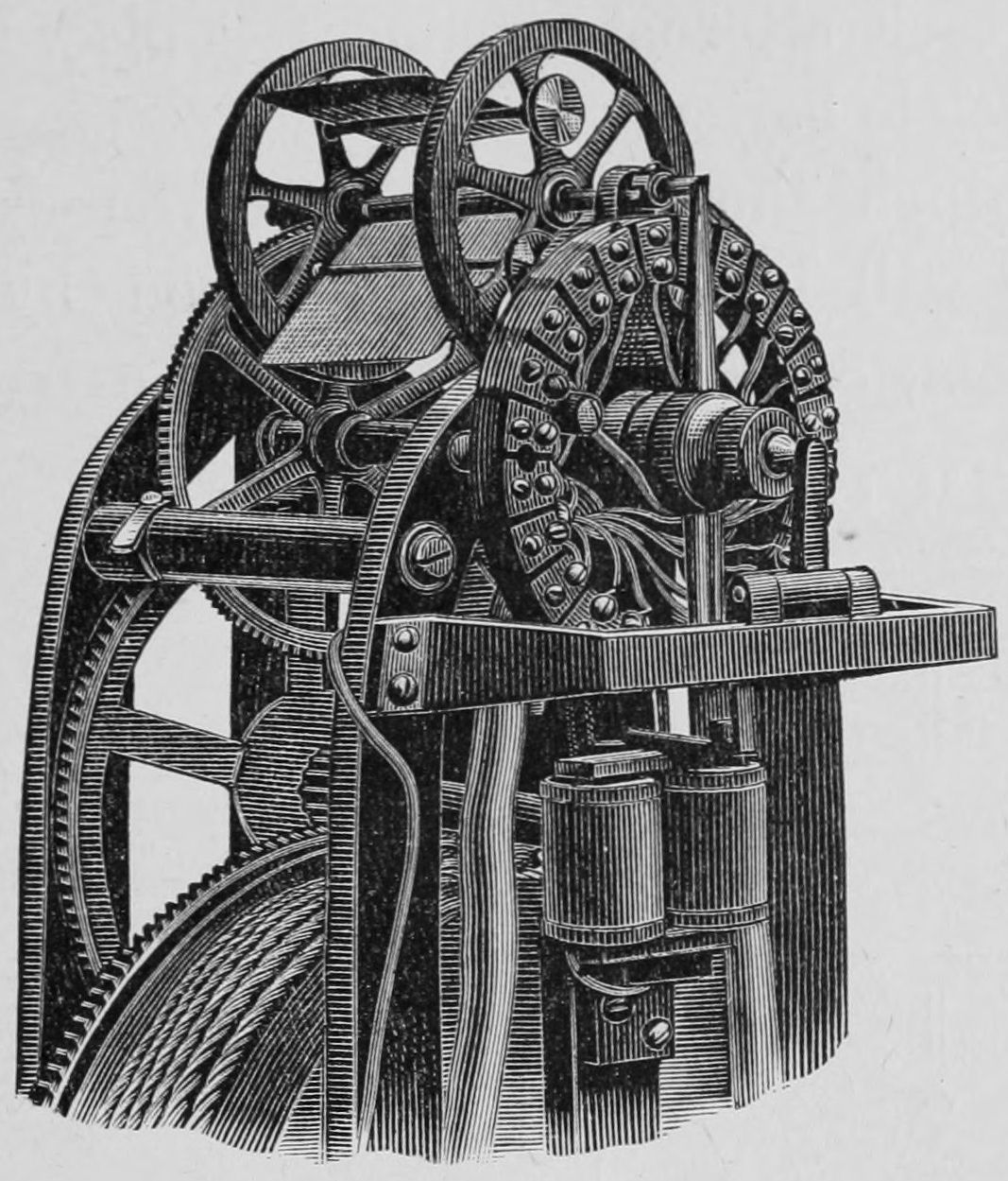 A shaft, connected by an arrangement of geared wheels to the drum, passes through the center of the segmented ring and carries a loose collar; a stout metal rod is firmly attached near its longitudinal center to this loose collar. One arm of the rod carries a laminated metal scraper, or contact brush, arranged to travel around the periphery of the ring, and in its revolution to make contact with each segment in succession. The contact brush is connected through the arm with one pole of the battery; and each segment—through its independent wire and magnet of the electro-exposors—with the other pole.