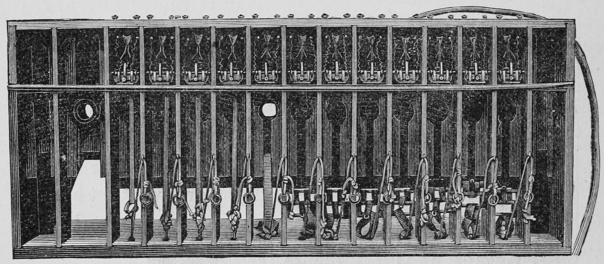The plate holder is constructed to hold three dry plates, each three inches by twelve inches; the front is divided into twelve compartments, each three inches square.