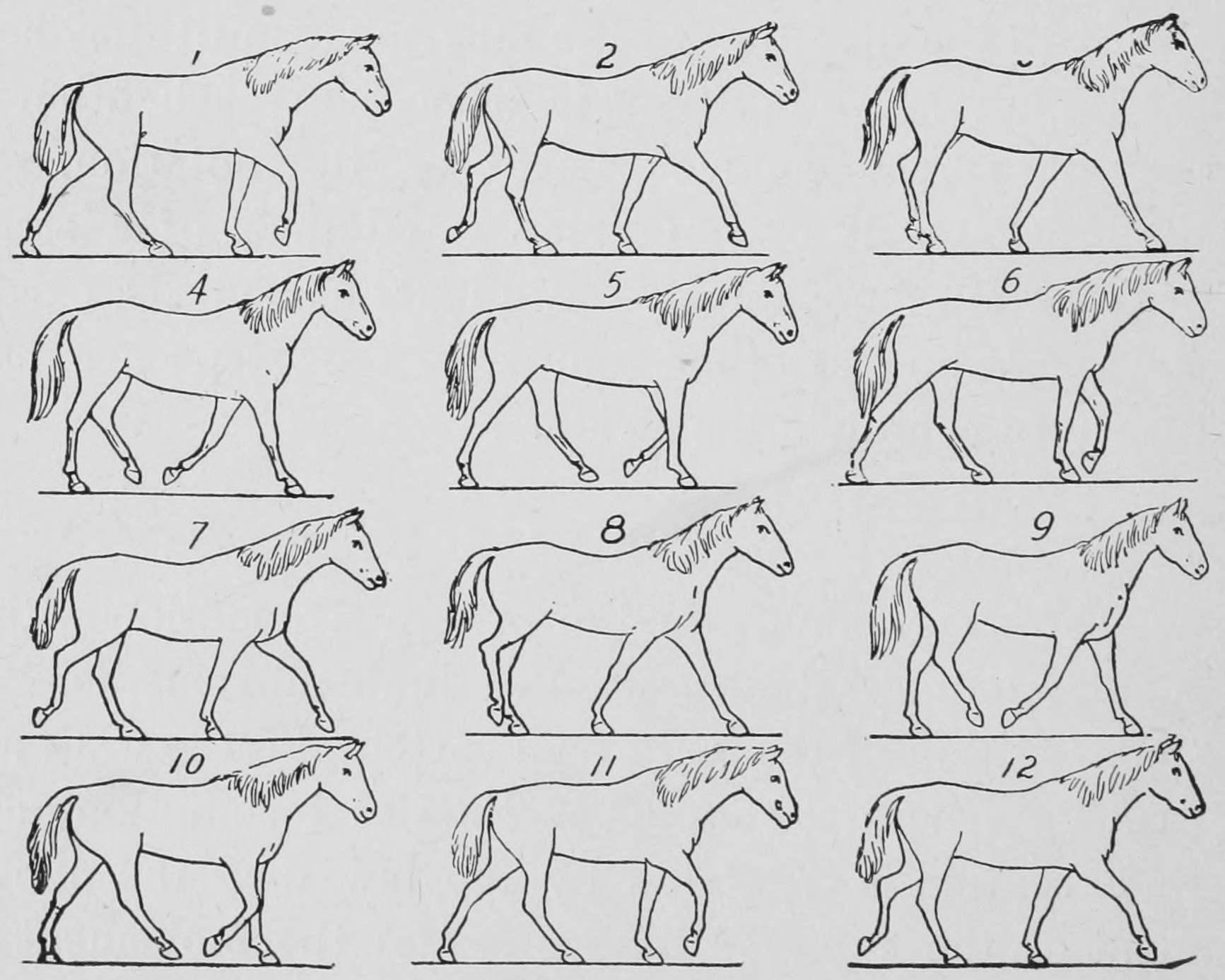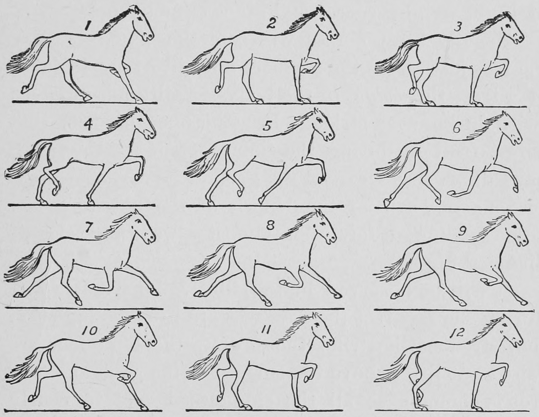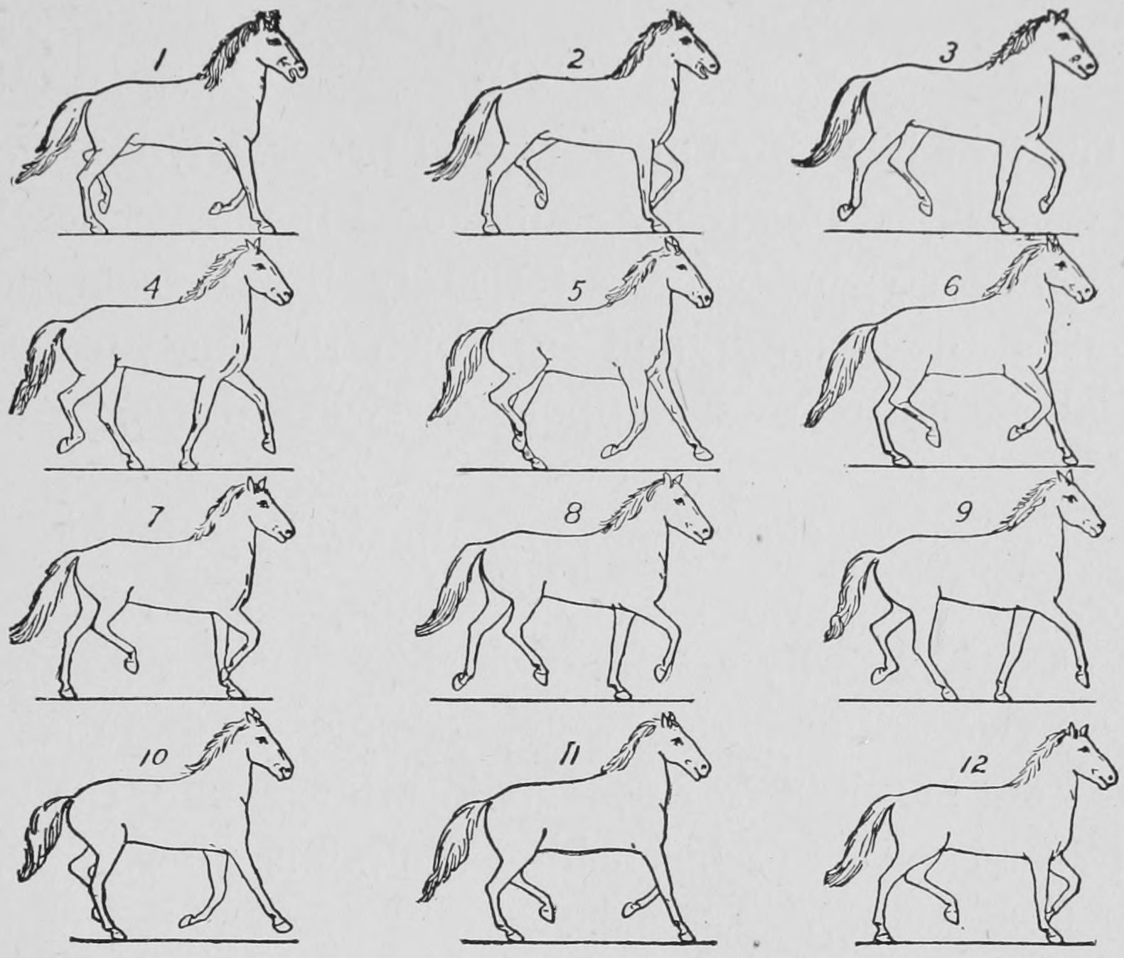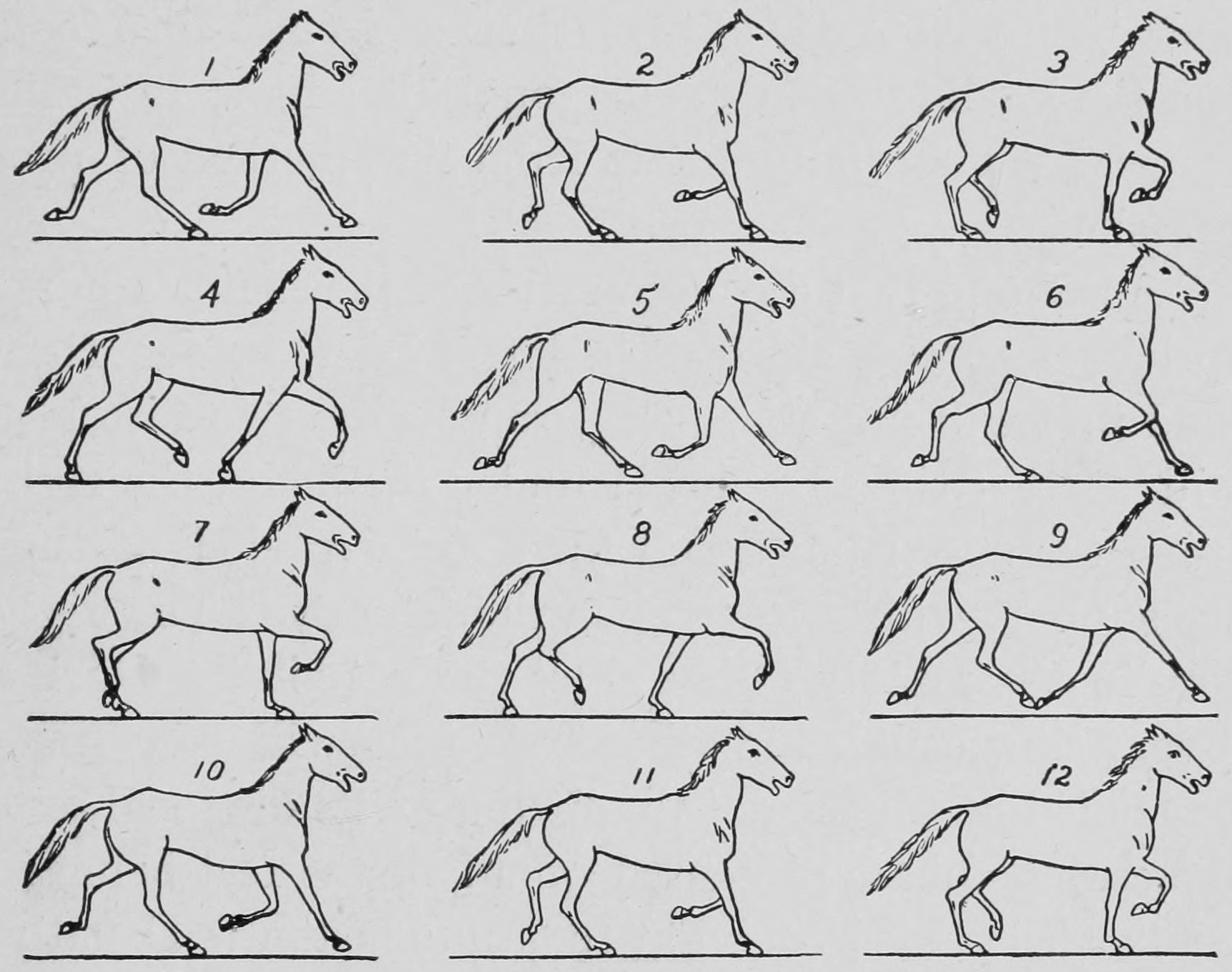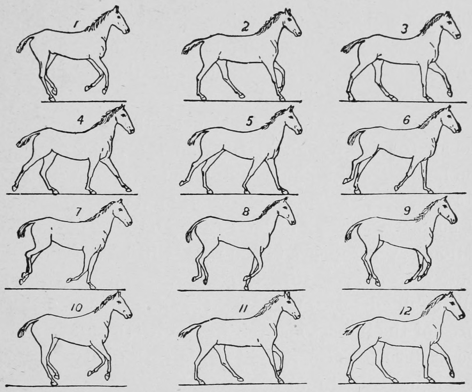 Under this impression he delayed his far Occidental expedition and returned to Chicago to find a commodious theater erected for this special purpose on the grounds of the Exposition, to which the name of Zoöpraxographical Hall had been given; the Science of Zoöpraxography having had its origin in the Author's first experiments in 1872. It is not intended in this monograph to give more than a synopsis of the usual course of Lectures on the subject, nor to reproduce any of the pictured or sculptured representations which are necessary for its proper elucidation, but merely to describe the common methods of limb action adopted by quadrupeds—especially by the horse—in their various acts of progressive motion, and to illustrate the most important phases of these movements by tracings from the original photogravures of the Author's work.